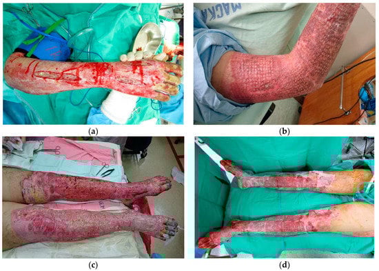 (a) Severe burn of the right hand, after escharotomy; (b) burn injury of the upper limb, status post-skin graft; (c) severe burn of the lower limbs with local necrosis; (d) burn injury of the lower limbs, after wound dressing.