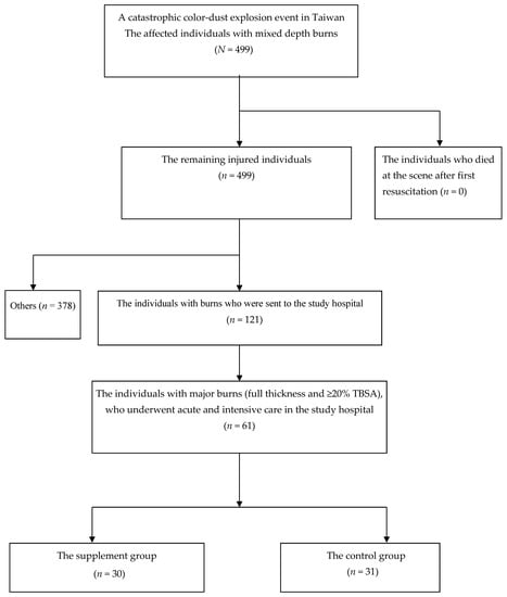 A flow diagram for patients with major burns in the catastrophic color-dust explosion event is shown in Figure 2. Through a nationwide medical system, the 499 patients were referred for further emergency treatment and acute medical care. Among them, 121 patients were sent to the study hospital, and 61 of these had major burns (full thickness and ≥20% TBSA), requiring hospitalization for acute and intensive care. Based on whether or not they received supplementation with additional vitamins and minerals, the individuals were classified into the supplement group (n = 30) and the control group (n = 31).