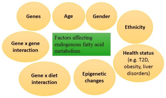 There has been huge progress in research into fatty acid metabolism over the last 20 years. Both single-nucleotide polymorphism studies and GWAS have focused on enzymes regulating endogenous fatty acid metabolism (Figure 3). Specifically, these enzymes regulate both desaturation and elongation processes in fatty acid metabolism. Their genetic variations are associated with altered accumulation of long-chain PUFAs in the cell membranes of tissues and plasma lipid components [19]. Epigenetic variation of these genes may also play a role in this context [37,38]. In the present review based on a literature survey and our own studies, we focus on studies investigating the genetic regulation of plasma and membrane fatty acids in relation to the putative interaction between dietary fat and fatty acid incorporation into different biomarkers used to evaluate the quality of dietary fat in observational and intervention studies.