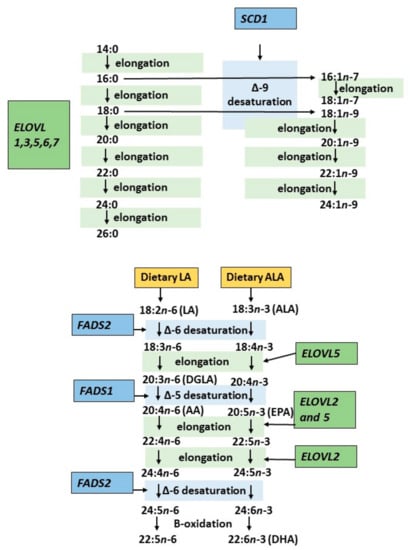 Simplified figure of the synthesis of fatty acids in the human body including key enzymes regulating fatty acid metabolism and genes coding them. AA, arachidonic acid; ALA, alpha-linolenic acid; DGLA, Di-homo-gamma linolenic acid; DHA docosahexaenoic acid; ELOVL, fatty acid elongase; EPA, eicosapentaenoic acid; FADS, fatty acid desaturase; LA, linoleic acid; SCD, stearoyl-CoA desaturase 1.