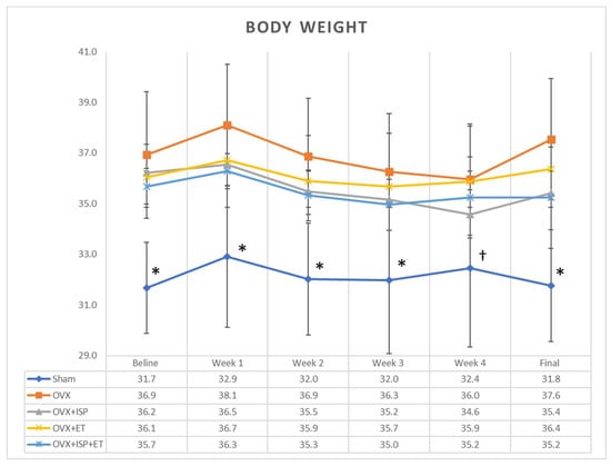 Changes in mean bodyweight (g) during the experiment (n = 8). * p < 0.05 for sham group compared with OVX, OVX+ISP, OVX+ET, and OVX+ISP+ET groups; † p < 0.05 for sham group when compared with OVX and OVX+ET groups by one-way ANOVA. OVX: ovariectomy; ISP: isolated soy protein; ET: exercise training.