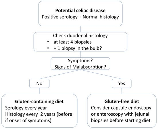 - Auricchio, R.; Tosco, A.; Piccolo, E.; Galatola, M.; Izzo, V.; Maglio, M.; Paparo, F.; Troncone, R.; Greco, L. Potential celiac children: 9-year follow-up on a gluten-containing diet. Am. J. Gastroenterol. 2014, 109, 913–921. [Google Scholar] [CrossRef] [PubMed]
