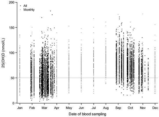 3.2. Seasonal Variation of 25(OH)D Concentrations