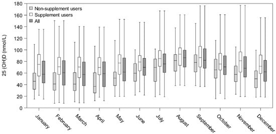 Box plot (box from Q1 to Q3) showing 25(OH)D (nmol/L) concentrations among all monthly participants (n = 167) and non-supplement users (n = 77). Tails show min and max values, while the line, –, indicates the median.