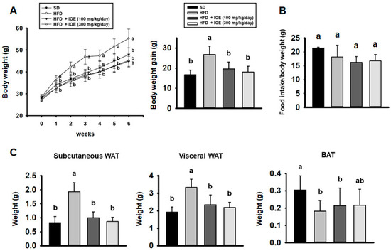 IOE reduces the adiposity of HFD-induced obese mice. Body mass gain (A), and food intake per unit body mass (B), measured during 6 weeks’ treatment with or without IOE. (C) Subcutaneous and visceral WAT mass. Data are expressed as mean ± S.D (n = 6). Values with different letters are significantly different; p < 0.05 (a > b).