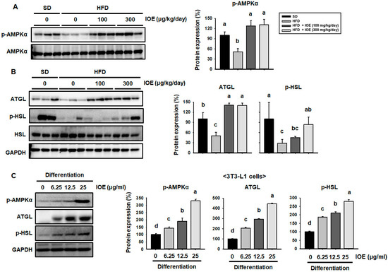 IOE treatment increases phosphorylation of AMPKα and the expression of lipolytic enzymes in 3T3-L1 adipocytes and the WAT of HFD-induced obese mice. Western blotting for AMPKα (A) and lipolytic enzymes (ATGL and HSL) (B) in WAT. (C) Protein expression of AMPKα, ATGL, and HSL in 3T3-L1 adipocytes after differentiation for 8 days. Data are expressed as mean ± SD (n = 6). Values with different letters are significantly different; p < 0.05 (a > b > c > d).
