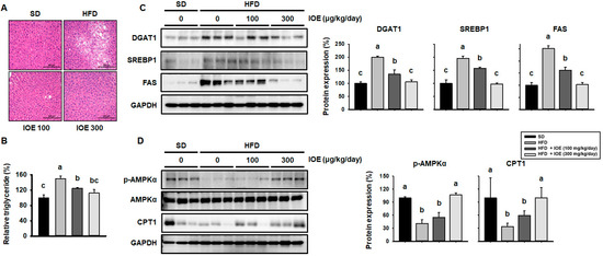 IOE treatment reduces hepatic lipid accumulation and regulates expression of proteins involved in lipogenesis and oxidation in HFD-induced obese mice. (A) Representative H&E-stained liver sections from mice fed a HFD ± IOE for 6 weeks. (B) Hepatic TG content. Protein levels of lipogenic genes (DGAT1, SREBP1, and FAS) (C) and β-oxidation genes (AMPKα and CPT1) (D) after HFD feeding ± IOE treatment for 6 weeks. Data are expressed as mean ± S.D (n = 6). Values with different letters are significantly different; p < 0.05 (a > b > c). DGAT1, diglyceride acyltransferase 1. SREBP1, sterol regulatory element-binding protein 1. FAS, fatty acid synthase. GAPDH, glyceraldehyde-3-phosphate dehydrogenase.