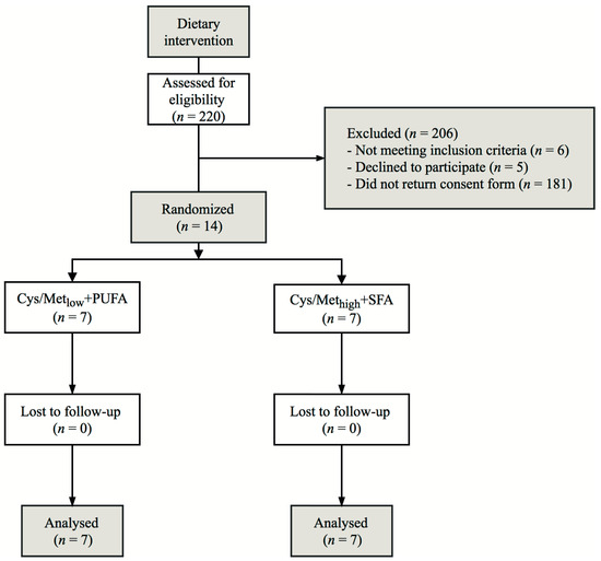Flowchart outlining the study design and progression. Cys/Metlow+PUFA, diet low in cysteine and methionine and high in polyunsaturated fatty acids; Cys/Methigh+SFA, diet high in cysteine, methionine and saturated fatty acids.