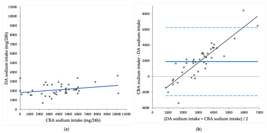 (a) Comparison of complementary biomarker assessed (CBA) sodium intake and diary assessed (DA) sodium intake (r = 0.297; p = 0.056); (b) Bland-Altman plot for CBA sodium intake and DA sodium intake, with significant proportional bias (r = 0.887; p < 0.001).