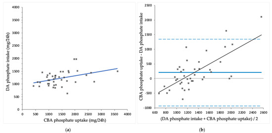 (a) Comparison of complementary biomarker assessed (UBA) phosphate uptake and diary assessed (DA) phosphate intake (r = 0.409; p = 0.008); (b) Bland-Altman plot for CBA phosphate uptake and DA phosphate intake, with significant proportional bias (r = 0.710; p < 0.001).