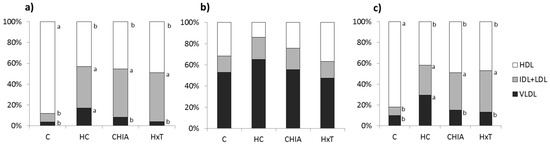 Lipid percentage transport in the different lipoproteins: VLDL, IDL + LDL, and HDL, in rats fed the experimental diets. (a) Cholesterol, (b) triglycerides, and (c) phospholipids. C, control-RP diet; HC, cholesterol-enriched, high-saturated/high-cholesterol, control-RP diet; HxT, hydroxytyrosol-RP, cholesterol-enriched, high-saturated/high-cholesterol diet; CHIA, Chia oil-RP, cholesterol-enriched, high-saturated/high-cholesterol diet. VLDL, very low-density lipoproteins; IDL, intermediate-density lipoproteins; LDL, low-density lipoproteins; HDL, high-density lipoproteins. Mean values within the same lipoprotein for C, HC, CHIA, or HxT with unlike letters were significantly different (p < 0.05, T2 Tamhane test), represented by vertical areas (a > b > c).