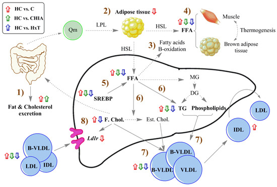 Proposed mechanism of the effect of the experimental diets on lipid and lipoprotein metabolism. Different colored arrows (red, green, or blue) indicate the increase (↑) or decrease (↓) for each marker assigned. Points: (1) cholesterol feeding increased fat and cholesterol excretion; (2) the decrease of dietary digestibility induces a reduction in body and adipose weights, with HSL activation and FFA release from adipose tissue; (3) Chia oil decreased liver FFA availability through the β-oxidation activation; (4) HxT decreased liver FFA availability through the activation of the thermogenesis process; (5) CHIA and HxT decrease SREBP-1c protein expression, contributing to a lower FFA amount; (6) FFA increase by cholesterol feeding, induced higher liver amount of TG, phospholipids, and esterified cholesterol; (7) the TG, phospholipids, and esterified cholesterol increase gave rise to the B-VLDL production. The lower FFA amount in CHIA and HxT induced lower lipid production and thus lower B-VLDL; (8) the liver cholesterol increase causes a reduction in Ldlr expression. CHIA and HxT, by reducing liver lipid storage, tended to increase Ldlr expression that in turn contributed to a reduction of atherogenic particles (B-VLDL, LDL, and IDL). C, control-RP diet; HC, cholesterol-enriched, high-saturated/high-cholesterol, control-RP diet; HxT, hydroxytyrosol-RP, cholesterol-enriched, high-saturated/high-cholesterol diet; CHIA, Chia oil-RP, cholesterol-enriched, high-saturated/high-cholesterol diet. VLDL, very low-density lipoproteins; IDL, intermediate-density lipoproteins; B-VLDL, cholesterol- enriched, very low-density lipoprotein; LDL, low-density lipoproteins; HDL, high-density lipoproteins; Qm, chylomicrons. LPL, lipoprotein lipase; HSL, hormone-sensitive lipase; FFA, free fatty acids; MG, monoglycerides; DG, diglycerides; TG, triglycerides; F. Chol., free cholesterol; Est. Chol., esterified cholesterol. SREBP, sterol regulatory element-binding protein-1c; Ldlr, low density lipoprotein receptor.