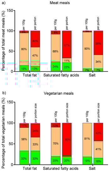 Traffic light distribution of meals per 100g and per portion based on the United Kingdom Food Standards Agency guidelines. (a) Meat category: total fat (n = 73), saturated fatty acids (SFAs) (n = 39), salt (n = 73); (b) vegetarian category: total fat (n = 39), SFAs (n = 10), salt (n = 39). Red indicates high, amber is medium, and green is low content of total fat, SFAs, and salt.