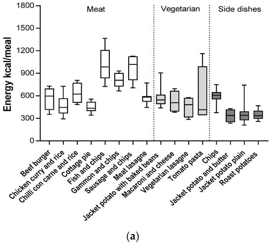 The data were analyzed using SPSS version 17.0 (SPSS Inc., Chicago, IL, USA), and p < 0.05 was considered statistically significant. All variables were checked for normality of distribution using histograms and the Shapiro–Wilk test. All results are presented as medians with interquartile range (25th and 75th percentiles) per 100 g and per portion. Differences in nutritional content between meat and vegetarian meal categories and between different types of meals within either the meat or vegetarian category (the most common meat and vegetarian meal types served across 8 hospitals were selected) were analyzed using the Kruskal–Wallis test and the Mann–Whitney U test, respectively. The nutrient content of meals was compared to the current UK guidelines for planning nutritionally balanced meals for adults 19–50 years old []. According to these recommendations, lunch should provide 30% of estimated average requirements (EARs) for energy [], no more than 30% of dietary reference values (DRVs) for fat and SFAs [], no more than 30% of a target salt intake of 6 g/day [], and at least 30% of the recommended fiber intake of 30 g/day []. In addition, meals were also classified according to the UK Food Standards Agency (FSA) “traffic light system”, which is a color-coded front-of-pack labeling scheme used in the UK to help consumers make healthier dietary choices []. Red indicates high, amber indicates medium, and green indicates low content of total fat, SFAs, sugar, or salt.