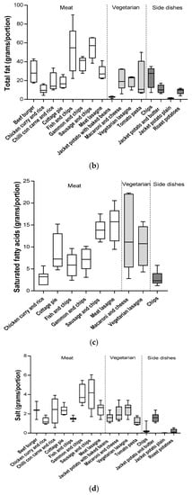 Variation in (a) energy, (b) total fat, (c) SFAs, and (d) salt for meat and vegetarian meals groups and for side dishes.