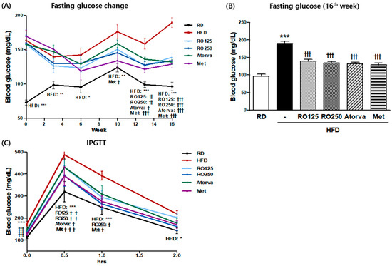 Diet-induced metabolic disease (DIMD) mice were fed an HFD and treated with Rubus occidentalis (RO) or drugs (atorvastatin or metformin) for 16 weeks. The changes in the fasting blood glucose (A) of the animals were observed every two weeks and the values from the final week are shown in (B). Mice glucose tolerance was analyzed by intraperitoneal glucose tolerance testing (IPGTT) (C). RD: regular diet, HFD: high-fat diet, HFD + RO 125: HFD-fed mice treated with a low dose (125 mg/(kg·day)) of aqueous extract of RO, HFD + RO 250: HFD-fed mice treated with a high dose (250 mg/(kg·day)) of RO. HFD + Atorva: HFD-fed mice treated with atorvastatin (10 mg/(kg·day)). HFD + Met: HFD-fed mice treated with metformin (250 mg/(kg·day)). Values are presented as mean ± standard error of mean (SEM) (n = 7, each group). * p < 0.05, ** p < 0.01, and *** p < 0.001 compared with RD mice. † p < 0.05, † † p < 0.01, and † † † p < 0.001 compared with HFD mice.