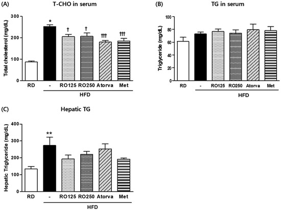 DIMD mice were fed an HFD with RO or drugs (atorvastatin or metformin) for 16 weeks. Serum from each mouse and the supernatant of their homogenized hepatic tissue solutions were prepared. Total cholesterol (T-CHO) (A) and triglyceride (TG) (B) levels in the serum as well as TG levels in the liver (C) were measured using a biochemistry analyzer. Mice were grouped as indicated in Figure 1. Values are presented as means ± SEM (n = 7, each group). * p < 0.05, ** p < 0.01, and *** p < 0.001 compared with RD mice. † p < 0.05, † † p < 0.01, and † † † p < 0.001 compared with HFD mice.