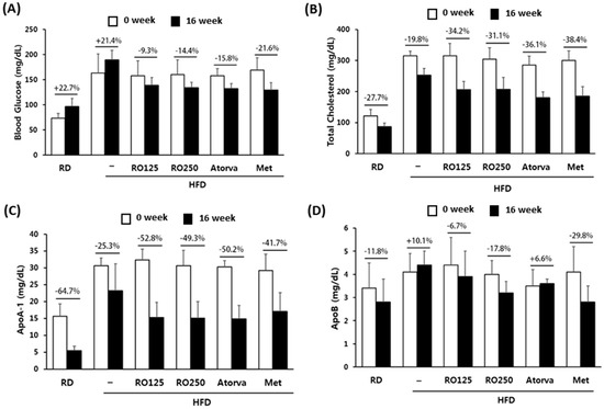 Representative biomarkers were compared before and after the oral administration of RO and drugs. Changes in blood glucose levels (A), total cholesterol (B), ApoA-1 (C), and ApoB (D) are presented with percentages. Mice were grouped as indicated in Figure 1. Values are presented as means ± SEM (n = 7, each group).