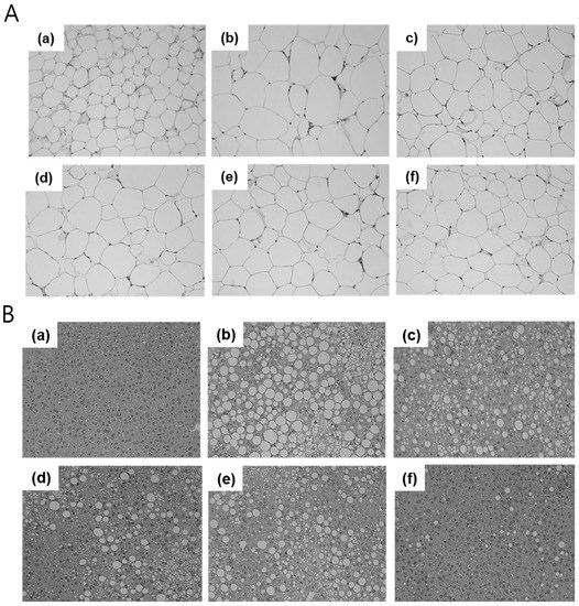 Serum and homogenized tissue solutions were prepared to determine lipid levels as follows. At the end of the experimental period, mice were sacrificed under ether anesthesia and blood was collected via cardiac puncture. The blood samples were centrifuged at 10,000 rpm for 5 min to isolate serum. The liver tissue and fat pad were removed and immediately frozen with liquid nitrogen before prolonged storage at −70 °C. Fifty milligrams of frozen liver tissue were then homogenized in 1 mL of PBS and centrifuged for 10 min at 4 °C and 3000 rpm. Various lipid contents (total cholesterol, triglyceride (TG), and lipoproteins) were measured in the samples using a biochemical analyzer (AU480, Beckman Coulter, Brea, CA, USA).