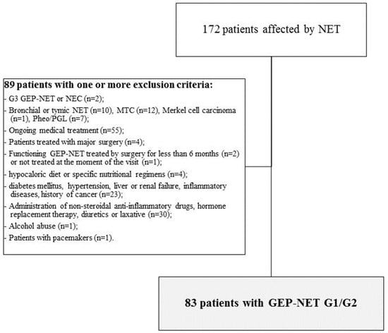 Flow chart of the studied subjects. A total of 83 patients affected by well differentiated GEP-NET G1/G2 selected from 172 patients with NET attending the ENETS Centers of Excellence Multidisciplinary Group for Neuroendocrine Tumors, University “Federico II”, Naples. Abbreviation: NET, Neuroendocrine Tumor; GEP-NET, Gastroenteropancreatic NET; MTC, medullary thyroid cancer; Pheo/PPG, Pheochromocytoma/paraganglioma; ENETS, European Neuroendocrine Tumor Society.