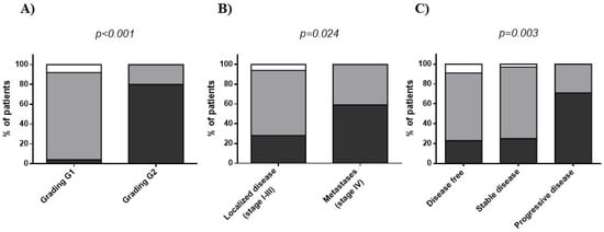 When classified GEP-NET patients based on tumor grade G1/G2, stage and disease status, the majority of patients with aggressive disease (GEP-NET G2, stage IV and progressive disease) presented a low adherence to the MD according to PREDIMED categories (Figure 2 and Table S2).