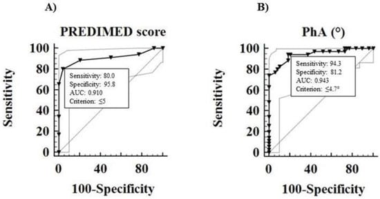 ROC analysis was performed to determine the cut off values of the PREDIMED score and PhA predictive of high grading, metastases, and disease status. A PREDIMED score ≤ 5 (p < 0.001, sensitivity 80%, specificity 95.8%; Figure 3A) and a PhA ≤ 4.7° (p < 0.001, sensitivity 94.3%, specificity 81.2%, Figure 3B), could serve as thresholds for significant increased risk of G2 tumor.