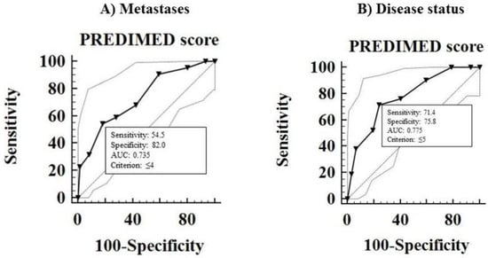 A PREDIMED score ≤4 could serve as a threshold for significantly increased risk of metastases (p < 0.001, sensitivity 54.5%, specificity 82%; Figure 4A). A PREDIMED score ≤5 was associated with a significant increased risk of progressive disease during follow-up (p < 0.001, sensitivity 71.4%, specificity 75.8%; Figure 4B).
