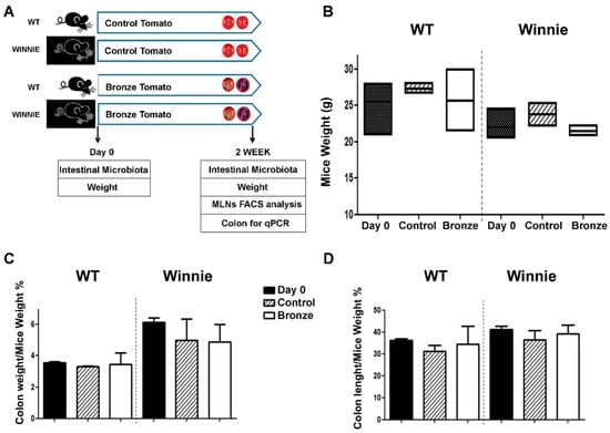 We recently demonstrated that the administration of a murine chow enriched with 1% of dried Bronze tomato was able to prevent/delay the intestinal damage induced by DSS administration using WT C57Bl/6 mice [19]. However, we did not determine whether the Bronze tomato dietary supplement was able to exert beneficial effects in the context of an ongoing intestinal inflammation. Here, we explored the effects of nutritional intervention in a model of spontaneous progressive ulcerative colitis. WT and Winnie mice were fed for 2 weeks with 1% control (Control) or bronze (Bronze) tomato-enriched diets. Figure 1A shows the experimental setup. Administration of the enriched diets did not alter the weight of WT and Winnie mice (Figure 1B) nor their colon weight and length (Figure 1C,D, respectively). Morphological analysis of the explanted colon did not reveal differences between Control and Bronze treated mice (Figure S1).