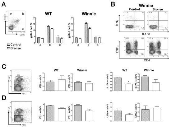 Following two weeks of tomato-enriched diets, we isolated and analyzed the intracellular cytokine production of the MLNs CD4+ T cells. The Bronze enriched diet resulted in a reduced percentage of CD25+Foxp3+ (Figure 2A) and increased percentage of TNFα+ cells (Figure 2B) compared to the Control diet. Both changes were not significantly different, but the trend was consistent independent of the genotype of the mice. A Bronze diet resulted in a significant reduction in the percentage of IL-17A CD4+ cells in WT mice and a similar trend in Winnie mice, while the percentage of IFNγ+CD4+ cells was unchanged (Figure 2C) both in WT and Winnie. Of note, the percentage of IFNγ+CD4− cells was reduced by the Bronze diet, particularly in Winnie mice (Figure 2D).