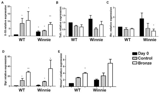 We previously demonstrated that the administration of a Bronze enriched diet was able to reduce the expression of inflammatory cytokines (Il-6, Tnf-α, Il-1α, Il-1β, Il-12) in the colon of WT mice [19] and that the expression level of Slpi was a reliable marker for the oral intake of quercetin [31,32]. We next analyzed the expression levels of Tnf-α, Ifnγ, Il-10, Slpi and Hmox1 in the colon of WT and Winnie mice. While both a Bronze and Control enriched diet significantly increased Il-10 expression in WT mice (Figure 3A), only a Bronze diet induced a higher increase in Il-10 in Winnie mice. Tnf-α and Ifnγ colon expression was generally lower in mice fed with Control or Bronze diets in both the Winnie and WT mice (Figure 3B,C). A significant reduction in Ifnγ expression was observed in Winnie mice fed with a Bronze diet compared to Day 0, but not in Winnie mice fed with a Control diet. Slpi, a major checkpoint for the anti-inflammatory activity of quercetin [31,32], was significantly induced by both the Control and the Bronze-enriched diets both in WT and Winnie mice (Figure 3D). Slpi induction was higher in Winnie compared to WT mice. Hmox1 expression was similar to that of Slpi, suggesting an anti-inflammatory pathway that is induced by the Bronze diet (Figure 3E).