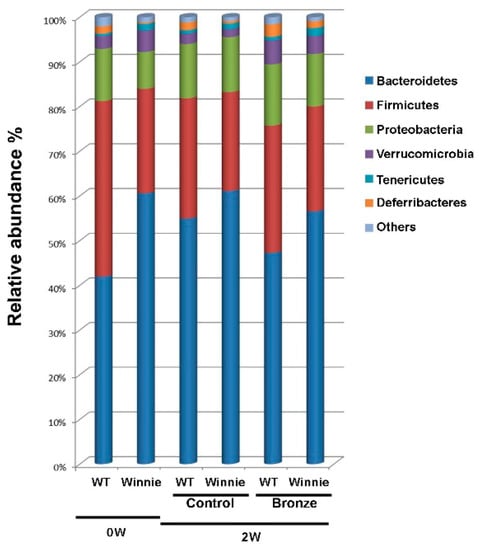Total bacteria found in feces of WT and Winnie mice. Relative abundance (%) of total (16S rRNA) bacteria, found at the phylum level in the fecal samples of WT and Winnie mice at Day 0 (0W) and after two weeks (2W) on Bronze (Bronze) or Control tomato (Control) diets.