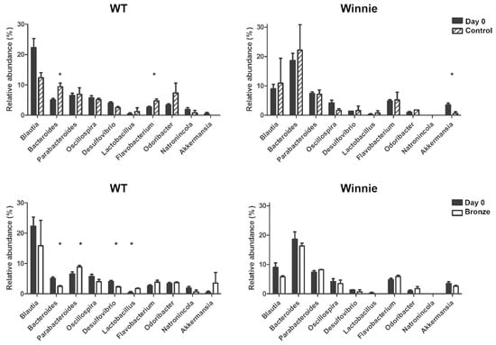 The Bronze-enriched diet affected the fecal bacterial genera of both WT and Winnie mice. Relative abundance (%) of total (16S rRNA) bacteria, found at the genus level in the fecal samples of WT and Winnie mice at T0 (Day 0, black bars) and after two weeks of Bronze (white bars) or Control tomato (striped bars) diet.