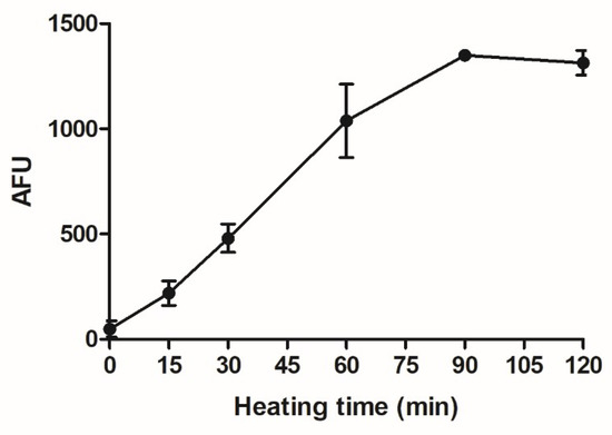 AGE-specific fluorescence of glycated casein measured at λex = 370 nm/λem = 440 nm in relation to the heating time of the three components casein from bovine milk (10 g/L), lactose (0.2 M) and glucose (11 mM). Values were corrected for baseline fluorescence; the data are shown as mean ± SD, n = 3.