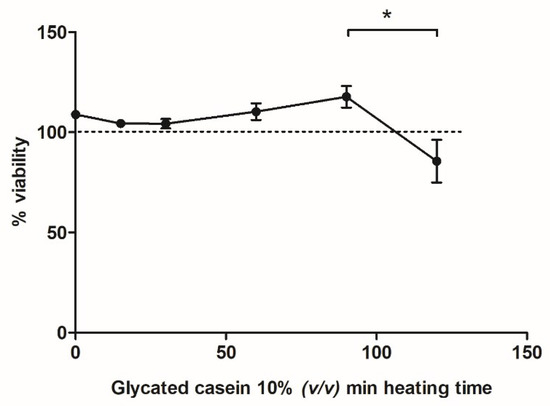 Cell viability of human macrophage-like cells after 6 h exposure to glycated casein from different heating time points (10% v/v), measured by the MTT assay. Results were normalized to control (50% v/v DPBS), which was set to 100% (dotted line). Data are presented as mean ± SD, n = 4, * = p < 0.05.