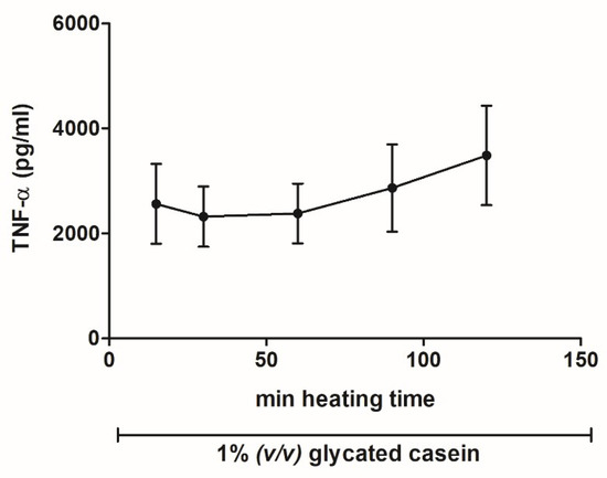 To investigate the influence of prolonged heating on the pro-inflammatory effects of glycated casein, we measured the TNF-α release of macrophages exposed for 6 h to glycated casein (1% (v/v)), which was heated for 15–120 min. As Figure 5 shows, TNF- α secretion did not change significantly between the different heating time intervals. There seems to be an increasing trend, but standard deviations are too large to draw that conclusion. Before adding the glycated casein to the cells, all samples were tested for endotoxin presence; the kit sensitivity was 0.06 EU/mL. No endotoxin was detected above these levels.