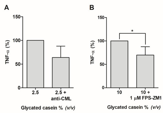 To confirm that the inflammatory reaction was caused by AGEs, an anti-CML antibody was added to mitigate the TNF-α secretion. Adding the anti-CML antibody to cells exposed to 2.5% (v/v), glycated casein reduced TNF-α secretion by 36 ± 24% (p = 0.1, Figure 6). Next to this, the cells were incubated with 10% (v/v) glycated casein with and without 1 µM of the RAGE antagonist FPS-ZM1. Addition of 1 µM of FPS-ZM1 led to a significant 30% decrease of TNF-α secretion.