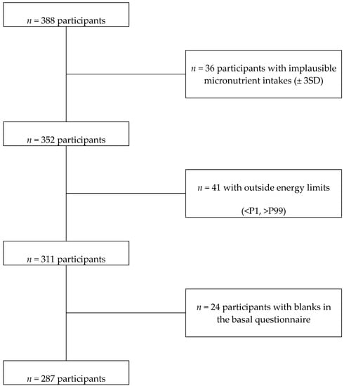 For the present study, parents who first handled the informed consent and replied to the baseline questionnaire before the end of 2017 (n = 388) were eligible (Figure 1). We excluded participants who reported total energy intake outside the defined limits (<P1 or >P99) or micronutrients intakes ≥3 standard deviations from the mean. We opted for a complete case analysis. Therefore, the final simple consisted of 287 participants with no missing information.