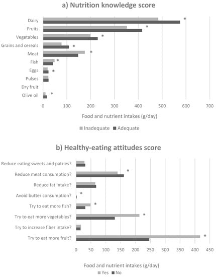 Mean food group consumption according to the positive answer in the nutrition knowledge score (a) and healthy-eating attitudes score (b); * p < 0.05.