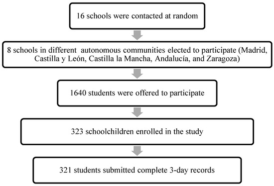One investigator contacted the schools. Once the school’s participation was confirmed by the director, an appointment was arranged with parents who were interested in the study. They attended an informative talk in which they provided signed consent for their son or daughter to participate in the research project. This meeting clarified all possible questions from the parents and informed them about the study in detail. All participants entered as volunteers, and the children provided complete information about their health data and a dietary questionnaire. Subsequently, a visit was made to the school in which the students returned the questionnaires, and some anthropometric measurements were made. Of the 1640 children who were offered to participate in the study, 323 were finally included (Figure 1).
