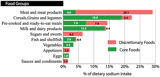 Additionally, discretionary foods in meat and meat products, sugars and sweets, appetizers and sauces and condiments contributed 85–100% to the total sodium intake of these groups, while core foods provided the most dietary sodium in cereals and milk and dairy products (85.2–97.1%) (Figure 2).