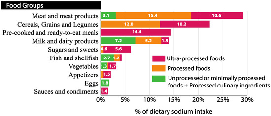 Sources of dietary sodium based on the degree of processing of food (NOVA classification) (n = 321) [22,28,29]. Contribution of the sodium content in different food groups to the total sodium dietary intake. Food groups and dietary sodium intake were derived from a 3-day food record. Foods were classified based on the degree of processing according to the NOVA system. They were organized into three groups in this figure: unprocessed or minimally processed foods + processed culinary ingredients, processed foods and ultra-processed foods. The sodium contribution was expressed as a percentage of the total dietary sodium intake.
