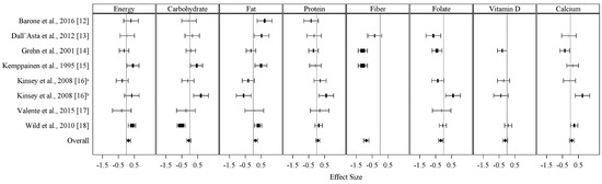 The nutrient composition of medically prescribed GF diets and GC diets were examined using a fixed-effects model. Figure 1 displays the available data for macronutrient and micronutrient intake for each diet and Table 3 reports mean effect sizes. The mean total daily energy was significantly higher in GF participants compared to the GC controls (mean effect size ± standard error: 0.14 ± 0.06; p = 0.03). Similar results were observed for total fat intake (0.14 ± 0.06; p = 0.03). In addition, both fiber and folate intake were significantly lower in GF individuals compared to controls (−0.88 ± 0.09; p < 0.001 and −0.17 ± 0.07; p = 0.02, respectively). Statistical heterogeneity was a concern for all nutrients except protein and vitamin D. When heterogeneity was addressed through a random-effects model, the lower daily fiber intake within the GF diet remained statistically significant (Q = 22.28; p < 0.001).