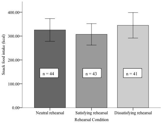 Contrary to the hypothesis, there was no significant effect of rehearsal condition on ad libitum snack intake, F(2,125) = 0.61, p = 0.55, and η2 = 0.01, see Figure 1.