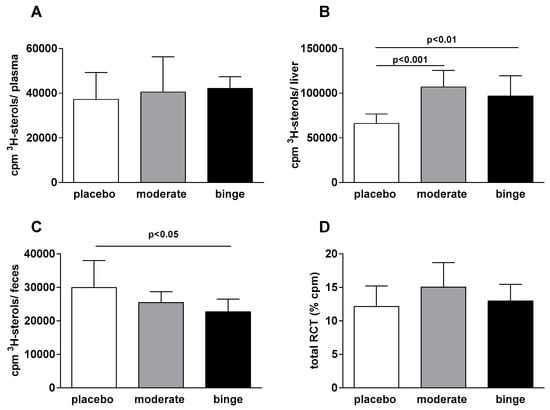 The amount of radioactivity in the liver was significantly higher in the moderate and binge groups compared to placebo (p < 0.001 and p < 0.01 respectively; Figure 1B), whereas the binge group excreted significantly less 3H-cholesterol at 48 h compared to the placebo (p < 0.05; Figure 1C). Overall, the removal of radioactivity from macrophages along the RCT pathway was higher, despite not statistically significant, in animals treated with a moderate dose of alcohol (Figure 1D), suggesting a slight promotion of the process.