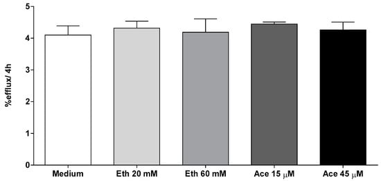 In the latter, we evaluated the direct effect of alcohol and its metabolite acetaldehyde on cholesterol efflux from macrophages. MPM were treated with two different concentrations of alcohol (20 mM and 60 mM) corresponding to the plasma concentration after a moderate and a heavy alcohol consumption in mice []. Similarly, acetaldehyde concentrations (15 μM and 45 μM) were selected in a range detected after alcohol intake in mice [,]. As shown in Figure 4, neither alcohol nor acetaldehyde affected cell capacity to eliminate cholesterol to extracellular acceptors. Therefore, also the involvement of increased macrophage efflux was not confirmed.