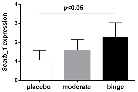 To investigate whether the increased radioactivity in the liver observed in moderate and binge groups was caused by a higher cholesterol uptake mediated by hepatic SR-BI, we quantified both gene and protein expression. As shown in Figure 5, Scarb1 gene expression was higher in the binge group compared to placebo (p < 0.05), whereas no difference was observed between moderate and placebo groups.