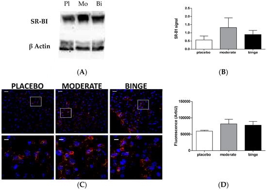 Effect of moderate and binge alcohol consumption on hepatic SR-BI protein expression. Western blotting analysis was performed on hepatic lysates, as described in the Methods Section. (A) Representative image of SR-BI expression in placebo (Pl), moderate (Mo), and binge (Bi) groups. (B) Signal quantification of SR-BI expression measured by ImageJ software. Signal quantification results were expressed as the ratio between SR-BI and the correspondent actin signal and data are expressed as mean ± SD (n = 3–4 per group). Results were analyzed using one-way ANOVA followed by Tukey’s multiple comparison test among groups. (C) Analysis of hepatic SR-BI expression (red signal) in placebo, moderate, and binge groups. Upper panels represent 20× magnification (thick = 25 µm); in lower panels, areas in the squares are enlarged (thick = 6 µm). (D) Results of red signal quantification were expressed as mean ± SD, after two independent analyses. Results were analyzed using one-way ANOVA followed by Tukey’s multiple comparison test among groups.
