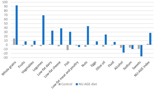 Following the one-year intervention, a significant increase in the NU-AGE index was found in the NU-AGE diet group compared to the control group (mean change 21.3 ± 15.9, p < 0.01, (Table 3). One-year differences in the intake of thirteen out of sixteen NU-AGE FBDGs were significantly better in the NU-AGE diet group compared to the control group (p < 0.05), except for low-fat meat and poultry (p = 0.53), eggs (p = 0.16) and sodium (p = 0.34). Major differences in changes expressed as percentages of dietary intake in the NU-AGE diet group compared to the control group were observed for whole grains (+79%), legumes (+70%), nuts (+49%), low-fat cheese (+46%), fish (+42%), low-fat dairy (+30%), and olive oil (+29%) (Figure 2).