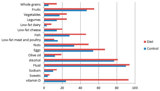 Following a one-year intervention, participants in the NU-AGE diet group achieved 6.2 ± 1.9 (range 1–12) out of 16 NU-AGE FBDGs compared to 4.5 ± 1.7 in the control group. The highest proportion meeting the NU-AGE FBDGs in both control and diet group was observed for fluid intake (90% and 94%, respectively), followed by alcohol use (77% and 81%, respectively) and egg consumption (54% and 67%, respectively) (Figure 3). The largest differences in the proportion meeting the guidelines between the NU-AGE diet and control group was observed for use of vitamin D supplement (69%), fish (18%) and nuts (16%). For low-fat meat and poultry, the proportion meeting this guideline in the NU-AGE diet group was lower at follow-up compared to the control group, possibly demonstrating an overall reduction in meat intake.