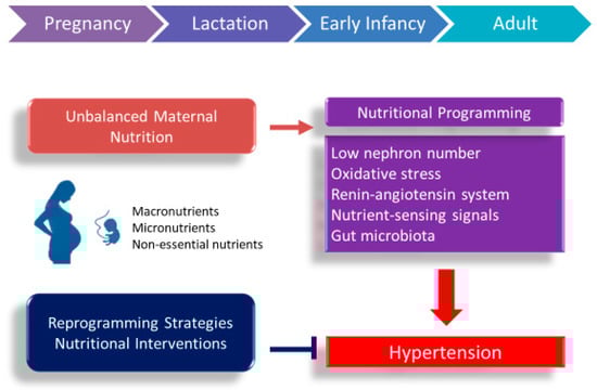 Hypertension remains an important public health challenge, despite treatment advances over the past decades. However, hypertension is a disease of multifactorial origins that can be treated to prevent more related disorders if found early. Although hypertension is more common in adults, it can occur at any age. Indeed, adult-onset hypertension can originate in early life [1]. Maternal nutrition during pregnancy and lactation has important implications for optimal fetal development and long-term health of the offspring. Imbalanced maternal nutrition produces fetal programming that permanently alters the body’s morphology and function and leads to many adult diseases, including hypertension [2]. This notion is framed as the developmental origins of health and disease (DOHaD) [3]. Conversely, the DOHaD concept leads to a shift in the therapeutic approach from adult life to early stage, before hypertension is evident. This strategy reversing the programming processes in fetal and infantile life is known as reprogramming [4]. Nutrition interventions have recently started to gain importance as a reprogramming strategy to prevent hypertension of developmental origins [4,5,6].
